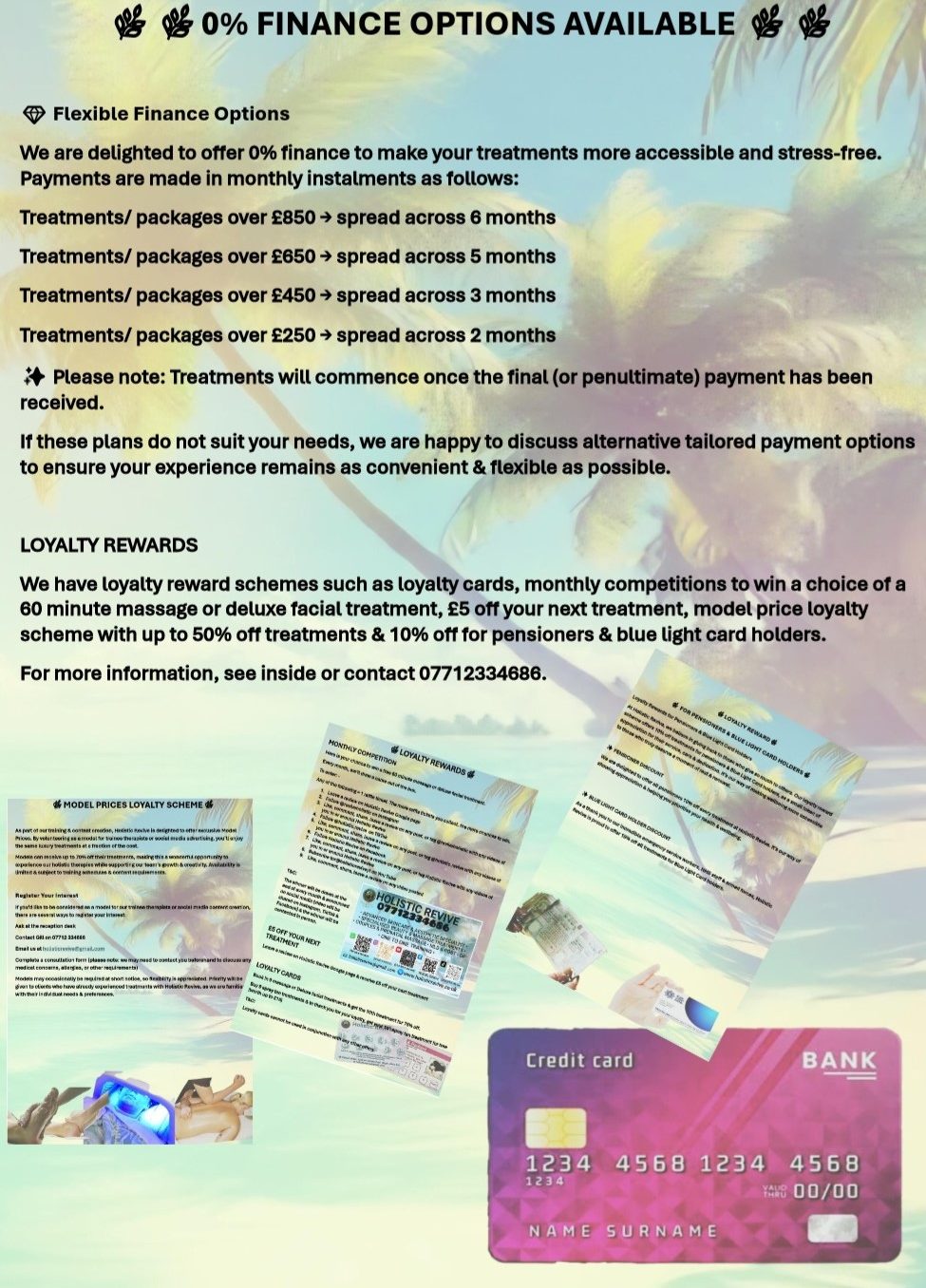 We offer 0% finance plans to make your treatments more accessible. Alternative arrangements can be discussed to suit your needs.